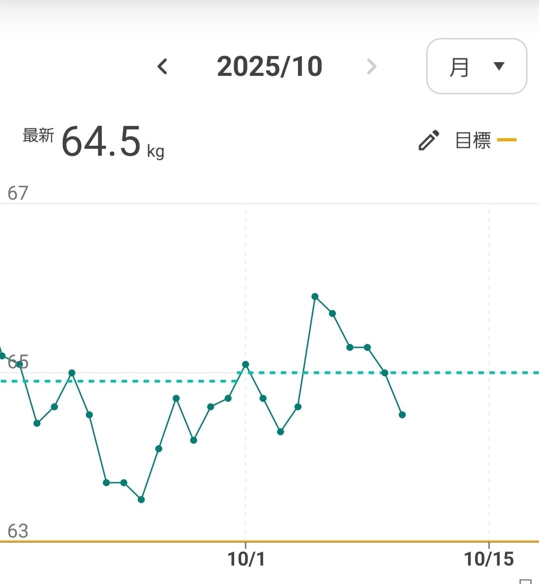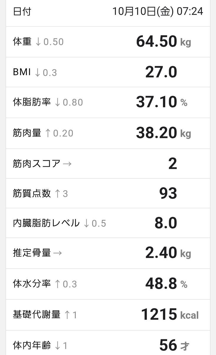 2025.10/10 体重 64.5kg(前日比-0.5kg) 体脂肪率 37.1%(前日比-0.8%) 内臓脂肪レベル 8.0↓ BMI 27.0 #ダイエット垢と繋がりたい pic.x.com/aAeARYRaNu