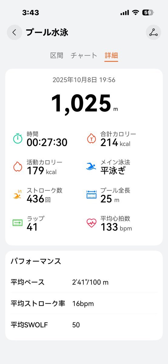 2025/10/08(水) 🐬水泳報告7日目🐬 距離:1025m 平泳ぎ+クロール 時間:26:54 一言:少しずつクロールやっても呼吸に余裕が出てきて面白くなってきた。クロールで楽に長く泳げるようになりたい #ダイエット #ダイエット垢と繋がりたい #有酸素運動 #脱スマホ #夜活 pic.x.com/UFZ2WeEJKb