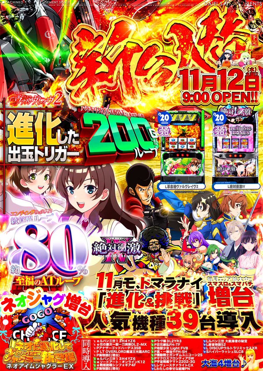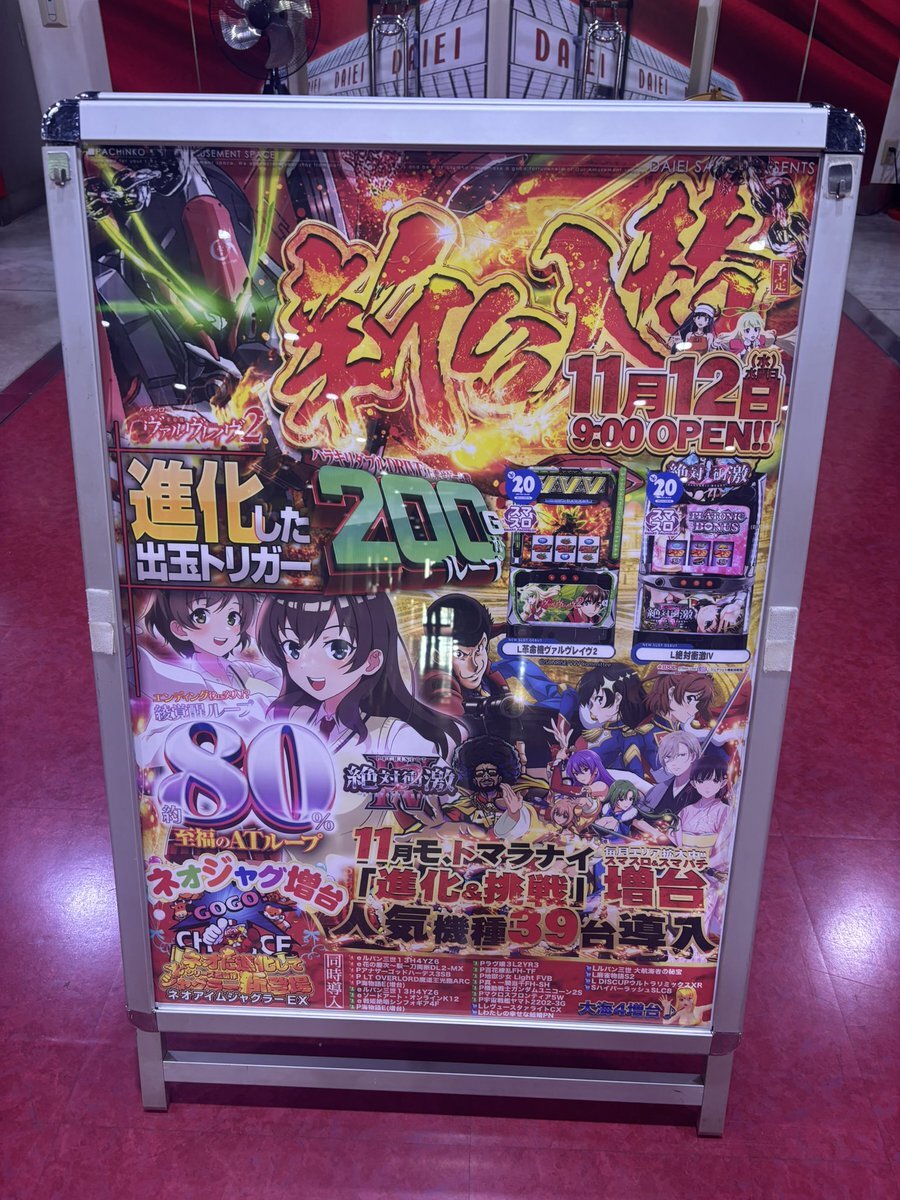 🔥店舗情報🔥 11月11日(水)ダイエー佐野店 🌈新装開店🌈9時OPEN!!(予定) いよいよ🔥ヴヴヴ2🔥が始動!! 🤡ネオアイム🤡増台!! ディスクアップUL・ハイパーラッシュも導入! #ダイエー佐野店 #佐野市 #新装開店 #挑戦 #ヴァルヴレイヴ2 #新台 #ネオアイムジャグラー pic.x.com/9MPO2u40Lm