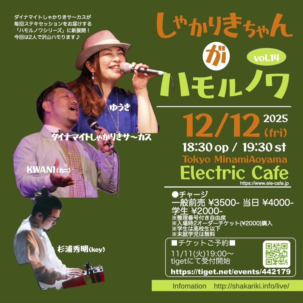 【南青山でワンマンハモルノワ!】 ダイナマイトしゃかりきサ〜カスLive 「しゃかりきちゃんがハモルノワ vol.14」 🗓12/12(金)19:30開演 🏠南青山Electric Cafe ele-cafe.jp 🎤出演 ダイナマイトしゃかりきサ~カス 杉浦秀明(key) 🎟11/11(火)19:00〜予約受付tiget.net/events/442179