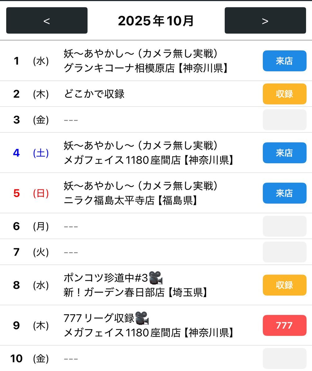 【最新版】 👷♂️10月スケジューーール👷♂️ 10月序盤はわりかし多めでございます🙏 今月DBは無いですが、皆さんから観たよ!って言っていただけてるポンコツ珍道中は3話目の収録があります🙏 777リーグはホーム戦+タッグ戦と戦況が大きく変わるかもしれない大一番を迎えます。