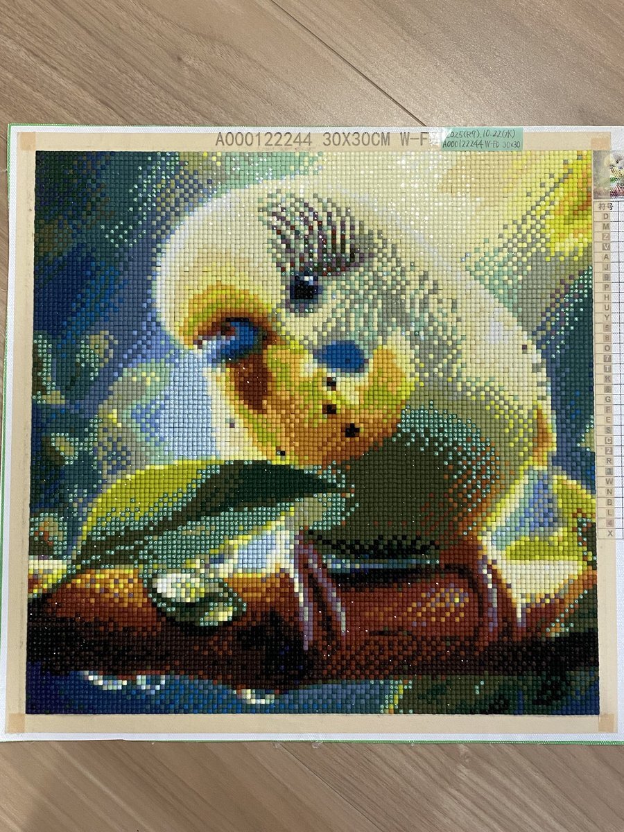 #ダイヤモンドアート 17作目 「A000122244 W-FD」、30×30、スクエアビーズです🦜🟩 2025(R7).10.26(火) フェアリーダストビーズが3箇所入ってます。 #セキセイインコ ちゃん pic.x.com/BmhtWvtcfK