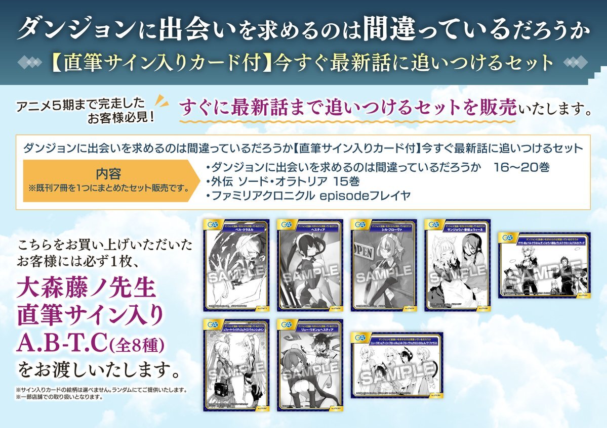 【書籍情報】 『#ダンジョンに出会いを求めるのは間違っているだろうか【直筆サイン入りカード付】今すぐ最新話に追いつけるセット』が店頭にて販売開始ナゴ✨ セットには、「直筆サイン入りカード」がランダムで1枚封入されてます‼️ ぜひお買い求めください🌟 #ダンまち pic.x.com/2KKTE7rhWj
