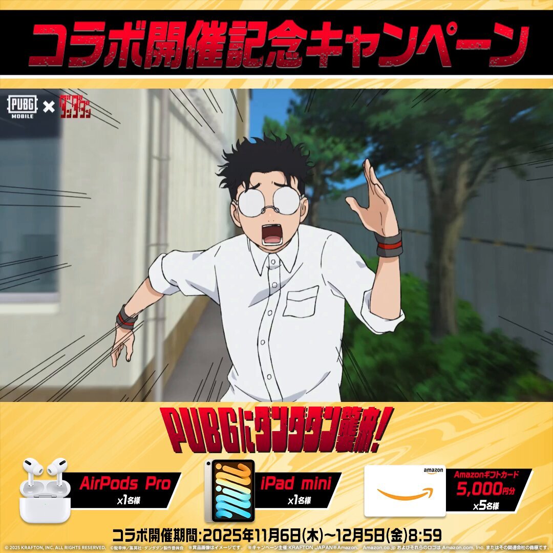 ◥◣👾🛸PUBGにダンダダン襲来!🛸👾◢◤ 『PUBG MOBILE』× TVアニメ『ダンダダン』 コラボ開催記念キャンペーン開催✨ 幽霊も宇宙人も、ぜんぶまとめて戦場に集合だッ❕ 怪奇×超常の!?コラボ限定アイテムが多数登場中 抽選で合計7名様に豪華賞品をプレゼント🎁 🔷 iPad mini ×1名様 🔷AirPods Pro