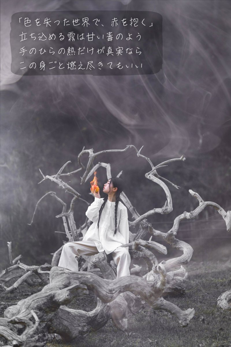 「色を失った世界で、赤を抱く」 立ち込める霧は甘い毒のよう 手のひらの熱だけが真実なら この身ごと燃え尽きてもいい #ポートレート #ダークファンタジー #創作 #ファインダー越しの私の世界 #キリトリセカイ pic.x.com/EpM4dkauDg