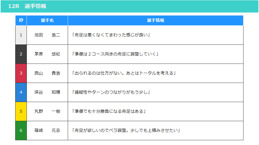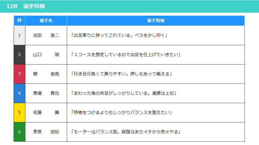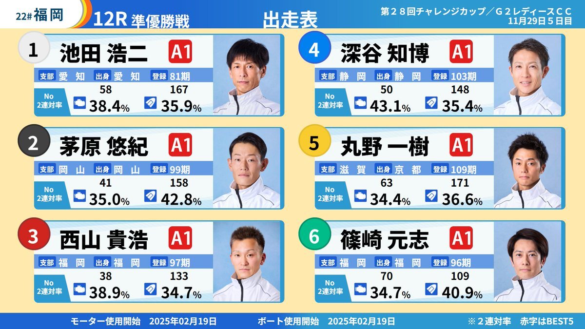 【🏆福岡SG #チャレンジカップ 5日目12R🏆】 舟券予想に役立つ情報をお届け! 福岡12R🔥最高潮の準優勝戦 一瞬たりとも見逃せない‼ 🚤出走表 🚤オリジナル展示データ 🚤選手コメント 🚤解説者予想 #ボートレース福岡 #チャレンジカップまとめ #持てるスキルフル装備で挑め pic.x.com/HbM6WLaRjL