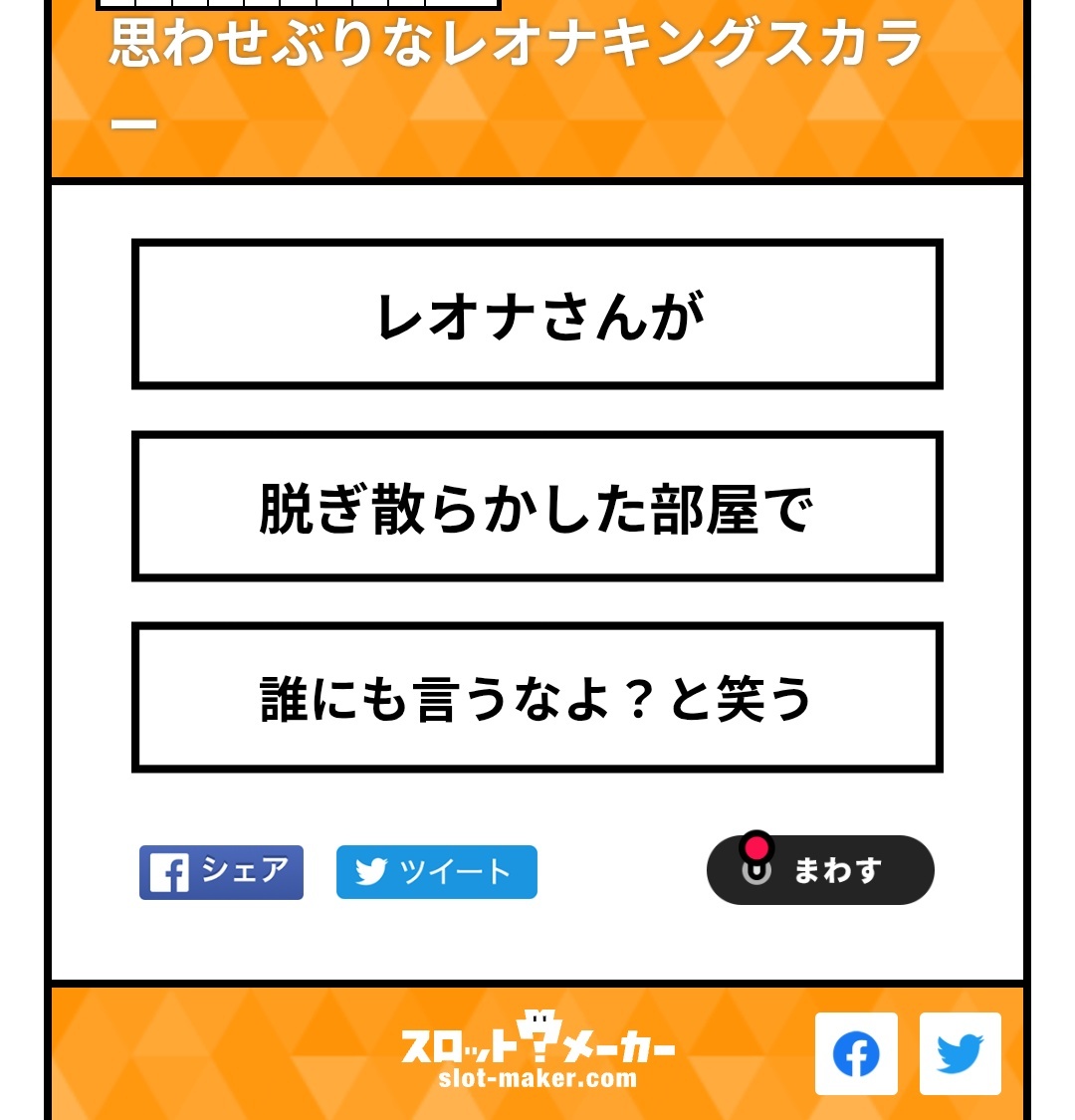 思わせぶりなレオナさんのスロットメーカー作りました。何かが始まりそうなだけ。特定CPなし。色々なシチュのパターンあるのでぜひ回してみてください〜🦁 slot-maker.com/slot/d783fcd1-… #思わせぶりなレオナキングスカラー #スロットメーカー