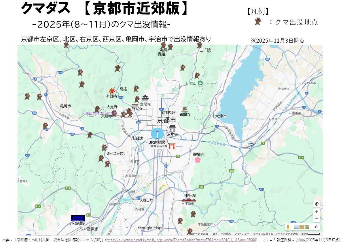 クマダス【京都市近郊版】を作成。 京都市周辺の山あいでの出没が多い。 北は、鞍馬、愛宕山。その南の嵯峨では観光地や市街地でも出没。 南は宇治市。 ライフル銃を使用して熊を駆除する方針を打ち出した警察は、世界的な観光地で惨劇が起こる前に、京都市の熊を駆除するべきだ。 #クマ #クマダス