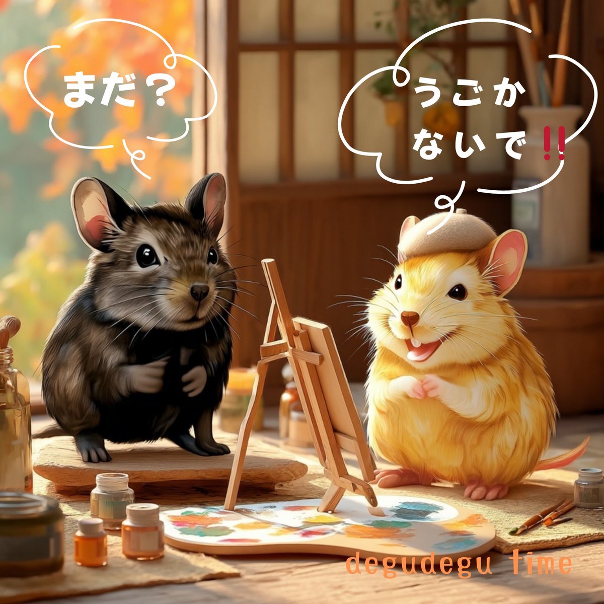 テンとサンのワクワク四季だより・秋🍂 今日は文化の日。 芸術の秋🍂 テンとサンの小さなアトリエへようこそ🎨 テンはモデルさん、サンは小さな画家さん。 #degudegu_time #テンとサン #デグー #テンとサンのワクワク四季だより #AIイラスト pic.x.com/hiqEvcqQbL