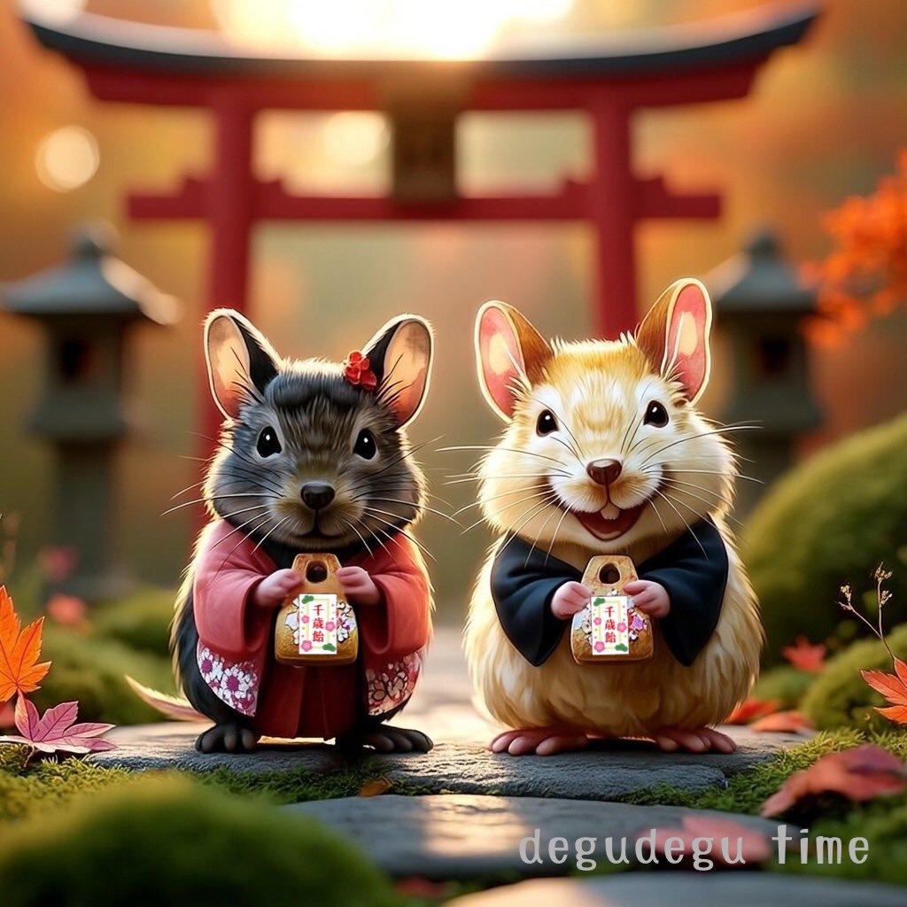 今日は七五三🎀 すこしおめかしして、 お参りに🍁⛩️ ちょっぴり緊張… これからもすくすく元気に✨ #degudegu_time #テンとサン #デグー #テンとサンのワクワク四季だより #AIイラスト pic.x.com/GLZJ9PwbyG