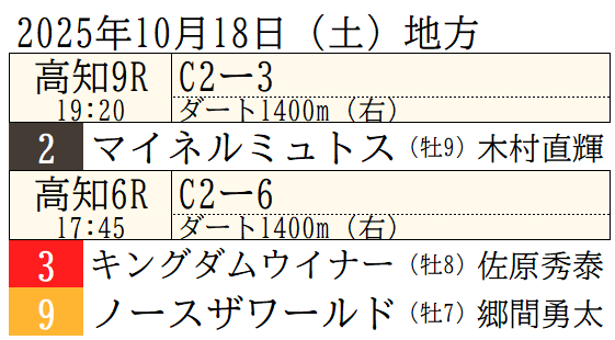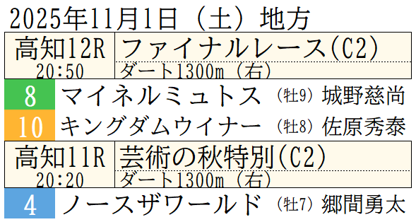 2025年11月1日(土)地方 #ディープインパクト産駒出走予定 高知競馬場🏇💨 12R #マイネルミュトス #キングダムウイナー 11R #ノースザワールド pic.x.com/ZVrmmGcq7X