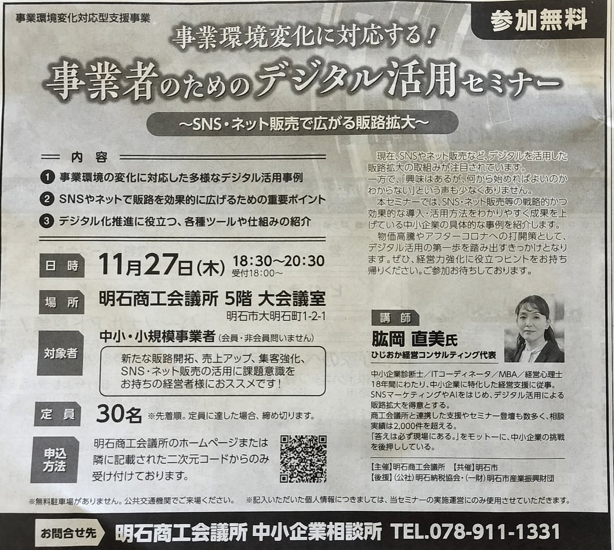 📝本日の神戸新聞に掲載! 本セミナーでは、実際に成果を上げた企業をお招きし、リアルな取り組みについて伺います。 📅今年最後の開催となる本セミナー。ぜひこの機会にご参加ください! hijioka-consul.jp/topics/info78/ #地域ビジネス #デジタル活用 #SNS集客 #明石商工会議所 pic.x.com/xrwEuHgOCJ