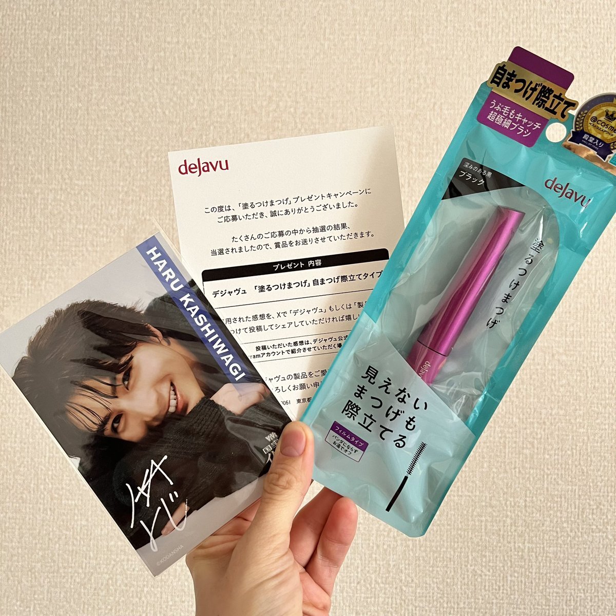 デジャヴュさんのキャンペーン当選しました✌🏻🧡柏木悠さんの起用ありがとうございました✨デジャヴュさんのマスカラはブラシが細くて細かくきれいに塗ることが出来るので嬉しいです☺️素敵なプレゼントありがとうございました👐🏻 #デジャヴュ #柏木悠 pic.x.com/lbloW04CRM x.com/dejavu_campaig…