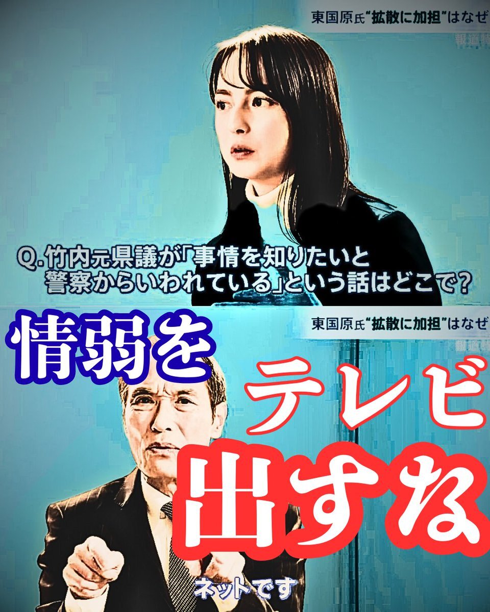 東国原英夫「テレビ・新聞・ネット等のそれぞれのメディアがそれぞれ万能ではありません。重要なのは受け手側のリテラシー力(りょく)です」 ↓ Q. 竹内元県議が「事情を知りたいと普察からいわれている」という話はどこで? 東国原英夫「ネットです」