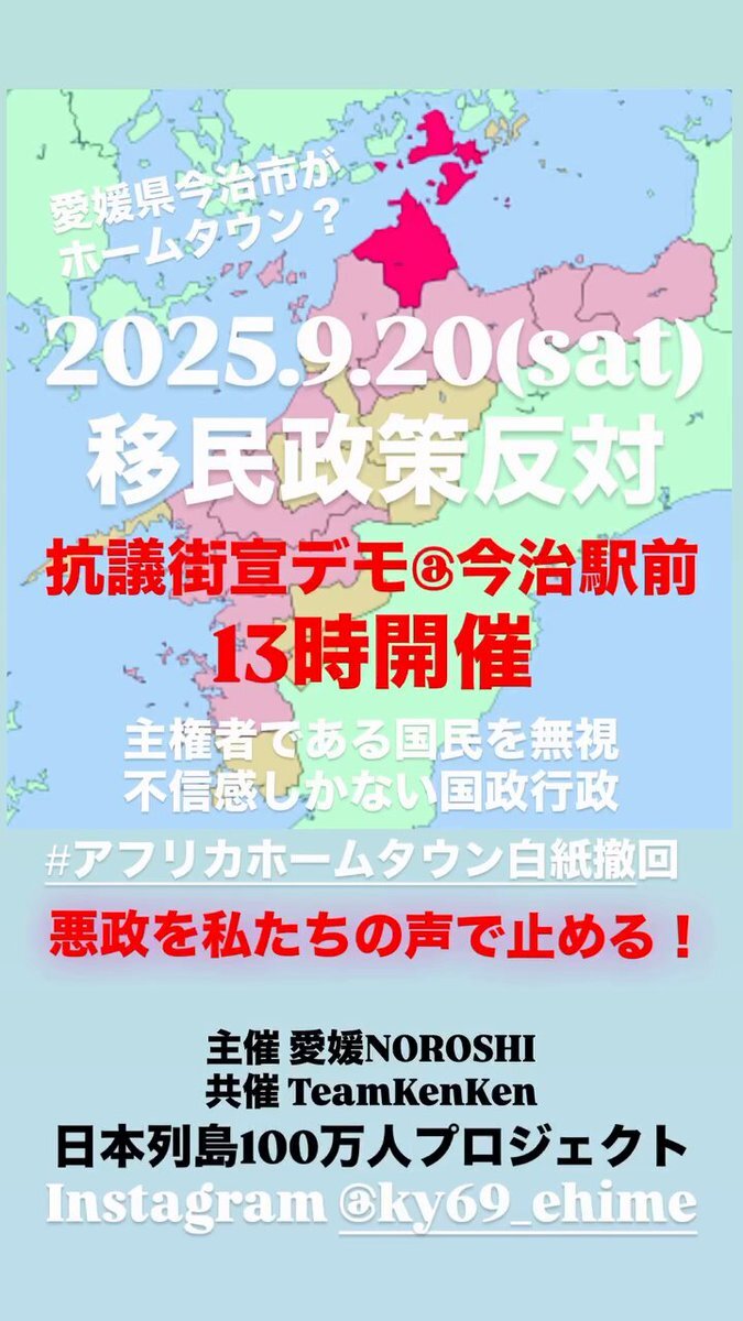 返信先:@o6yata暦姫!やりまっせ💪🔥 同志お仲間皆さん 急遽決まりました! 移民政策反対抗議街宣デモ📢 2025.9.20(土)13時〜 愛媛県今治駅前にて開催しますので ご参戦ご支援ご協力! シェア拡散宜しくお願い致します! #移民政策反対 #アフリカホームタウン白紙撤回 #愛媛県今治市 #日本列島100万人プロジェクト