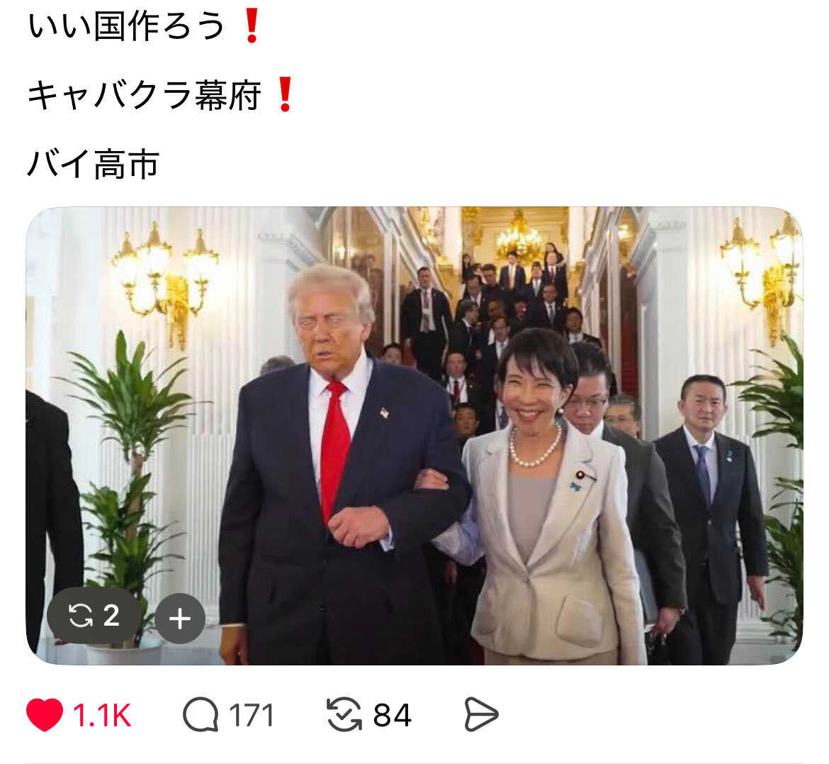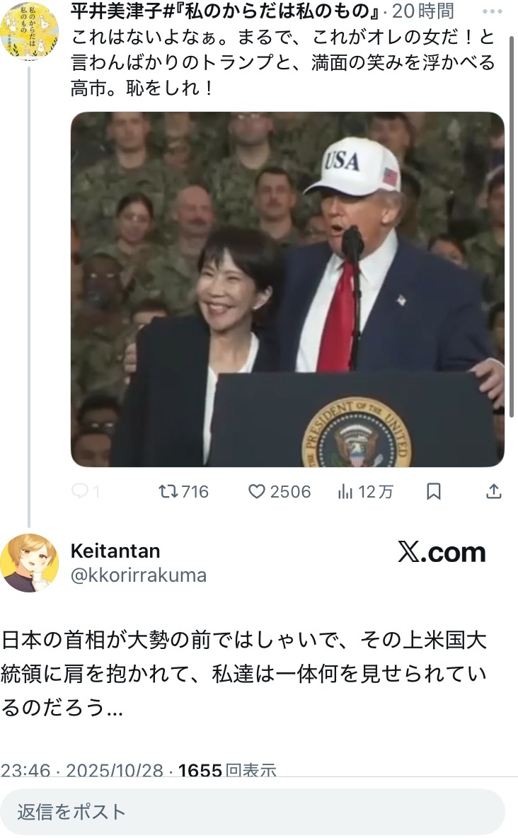 返信先:@6LEjH8DcDxuhN1s#デマウヨ「高市総理が『はしゃぎすぎ』などというが本気ではしゃいでいる筈があるか。日本のために高市流で日米蜜月を構築しようと神経をすり減らして頑張ってくれているのだ」←どう見てもはしゃぎ過ぎじゃん。ホストにのめり込む高齢の女社長みたくx.com/sputnik_jp/sta… x.com/masirito22/sta… pic.x.com/a1rFfIFvT4