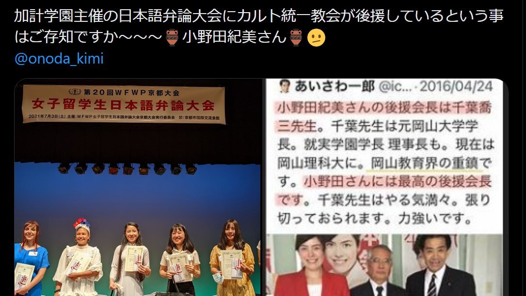 返信先:@Sankei_news#統一教会ニュース「高市陣営キャプテン小野田紀美議員「地方議員時代から勝手に高市早苗を推し続けてかれこれ10数年,推してきて本当に良かった」☜同じ安倍スガ一味の大先輩だけに,統一教会と癒着している議員(#壺議員)仲間だから?#自民党は統一教会 x.com/shinpeinakama/… x.com/newssharing1/s…