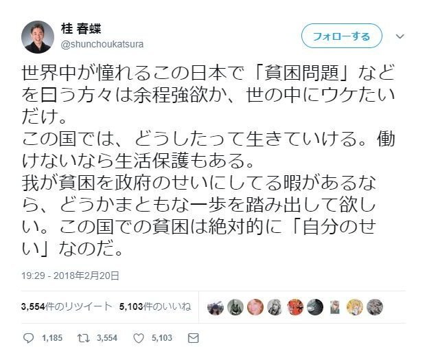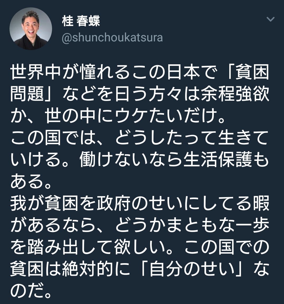返信先:@Malaysiachansan1#デマウヨ「この超低失業率の日本で低賃金の仕事すら見つからない様であればそれは無能というより無理ですそういう方は生活保護を受けましょうその方が本人にも社会にもプラスですセーフティネットがある点でも日本は素晴らしい国です」お前...ネトウヨ落語家 #桂春蝶 じゃね?x.com/PistonMach/sta… pic.x.com/TAvUupG19e