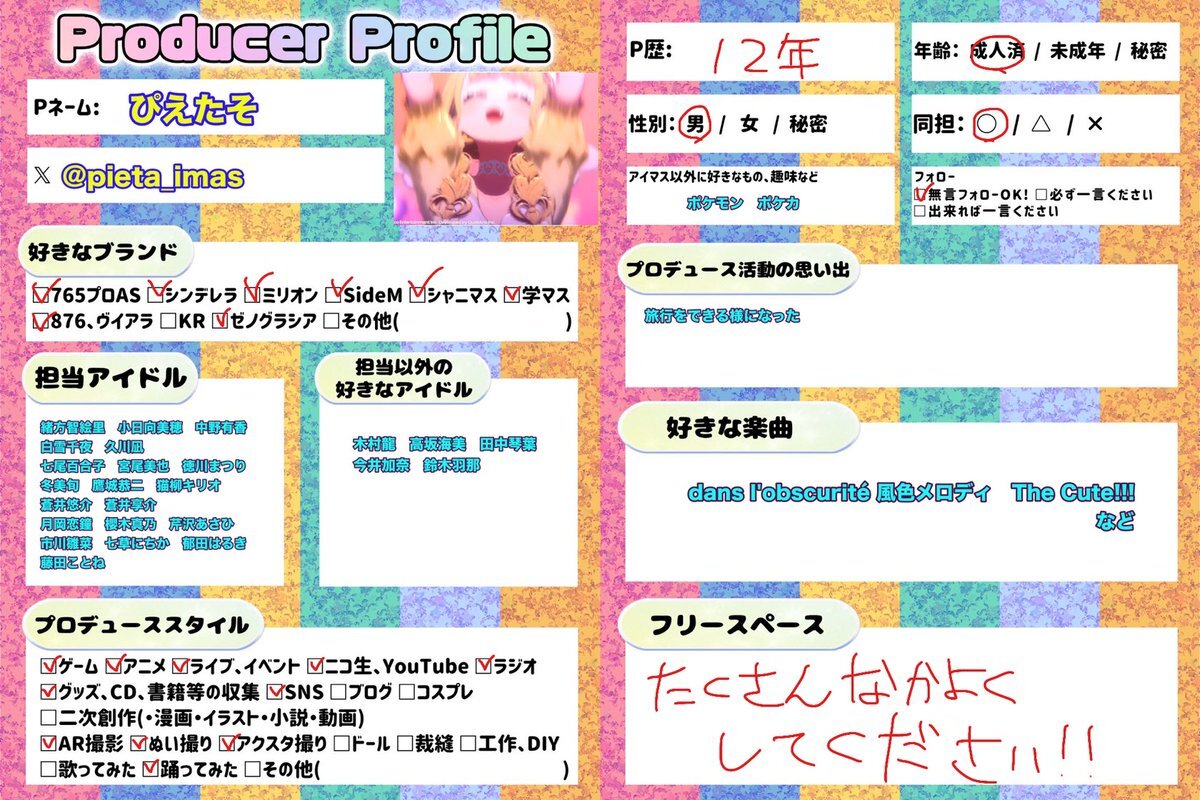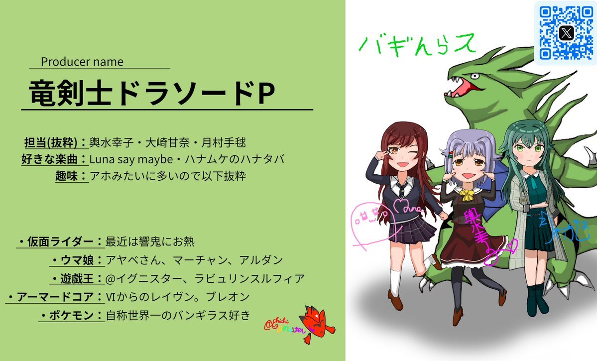乙倉悠貴、葛城リーリヤ担当のデレ学Pです。 アイマスが好きな人ともっとアイマスについて語りたいと思ってます。 絵を描きます、今デレ190人全員描く企画をやっています学マスの絵も描きます アイマス好きそうな人はフォロバします #学マスPさんと繋がりたい #デレマスPさんと繋がりたい pic.x.com/6wvm3jY9E0