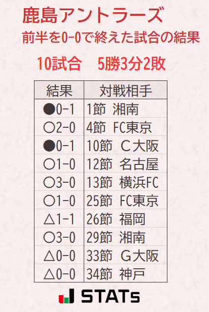 #鹿島アントラーズ 前半を0-0で終えた試合の結果 📊10試合 5勝3分2敗📊 ☑直近7試合は負けなし ☑直近2試合はスコアレスドロー ☑10試合中7試合が無失点 ☑前回の #横浜FC戦 は3-0勝利 ※2025年J1の同状況のリーグ平均勝率は33.5%、引き分け率は33.1% #データスタジアム pic.x.com/ukXlPbgOxv