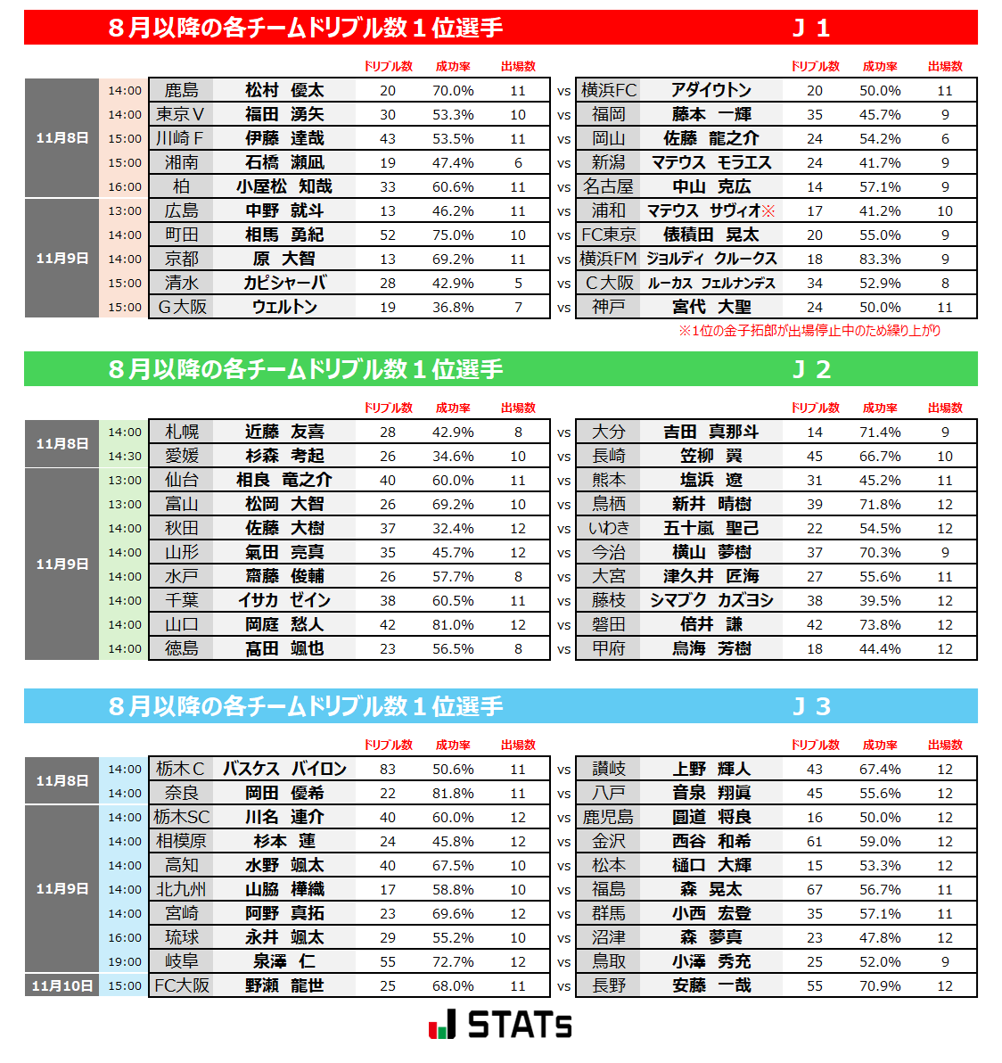 各チームの8月以降のドリブル数トップを今節の対戦カード別に列記。 苦しい時の頼りになる突破役、または警戒すべきキーパーソンとして注目。 #Jリーグ #データスタジアム pic.x.com/mGfmvPMT7A