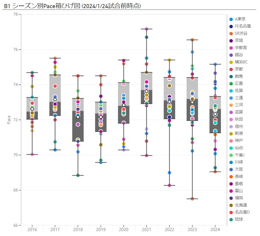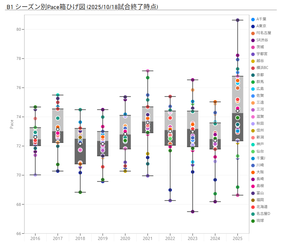 今季はアップテンポなバスケをするチームが増えた的な投稿が散見されたので、まだ6試合ですがB1のシーズン別Pace箱ひげ図を 中央値(箱の真ん中の横線)を見ると今季はかなり上の方にあります。現時点でアップテンポなチームが多いという肌感はあながち間違いではないかも #データスタジアム pic.x.com/26Eizv31So x.com/ds_yanadori/st…
