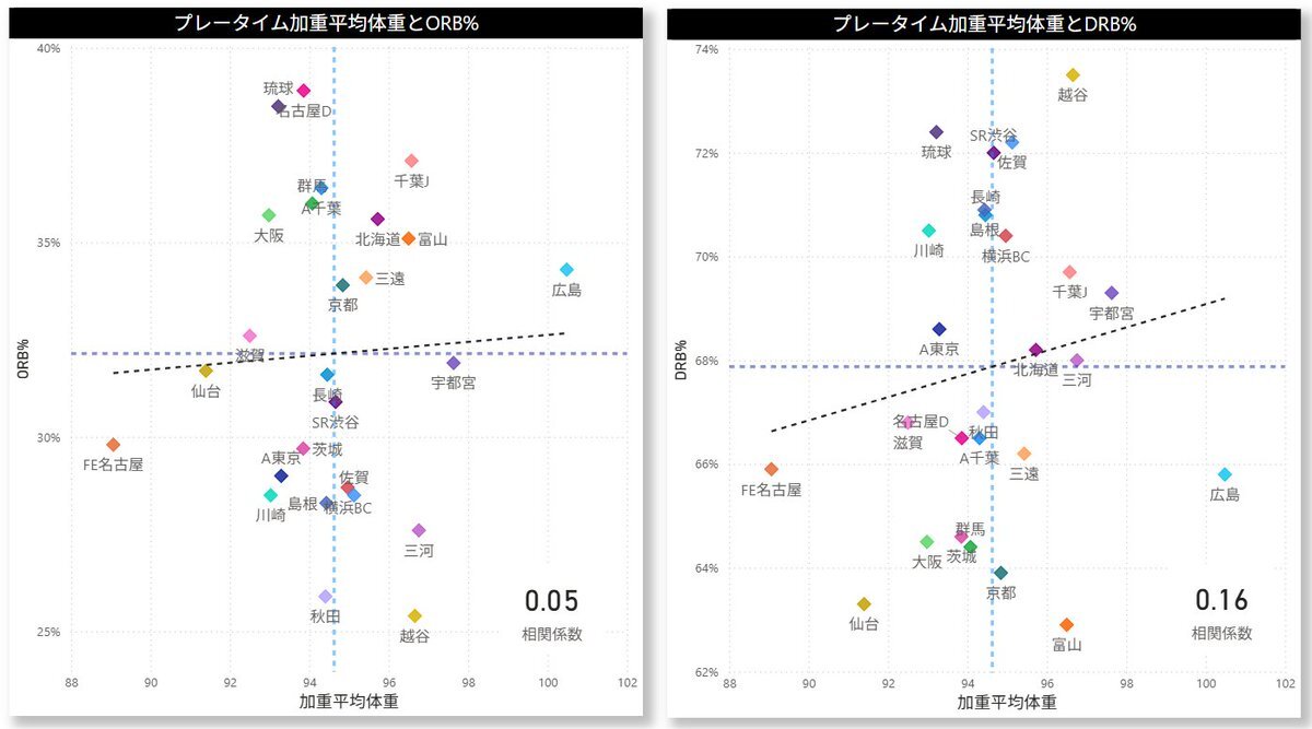 続けてプレータイム加重平均体重とオフェンス・ディフェンスリバウンド獲得率。相関係数では体重とディフェンスリバウンド獲得率が一番高いですが、0.16なので微妙です。体重でリバウンドが取れる訳でもない 広島とFE名古屋がプレータイム加重平均体重で頭一つ抜けてる感あります #データスタジアム pic.x.com/IK8mohSgPd x.com/ds_yanadori/st…