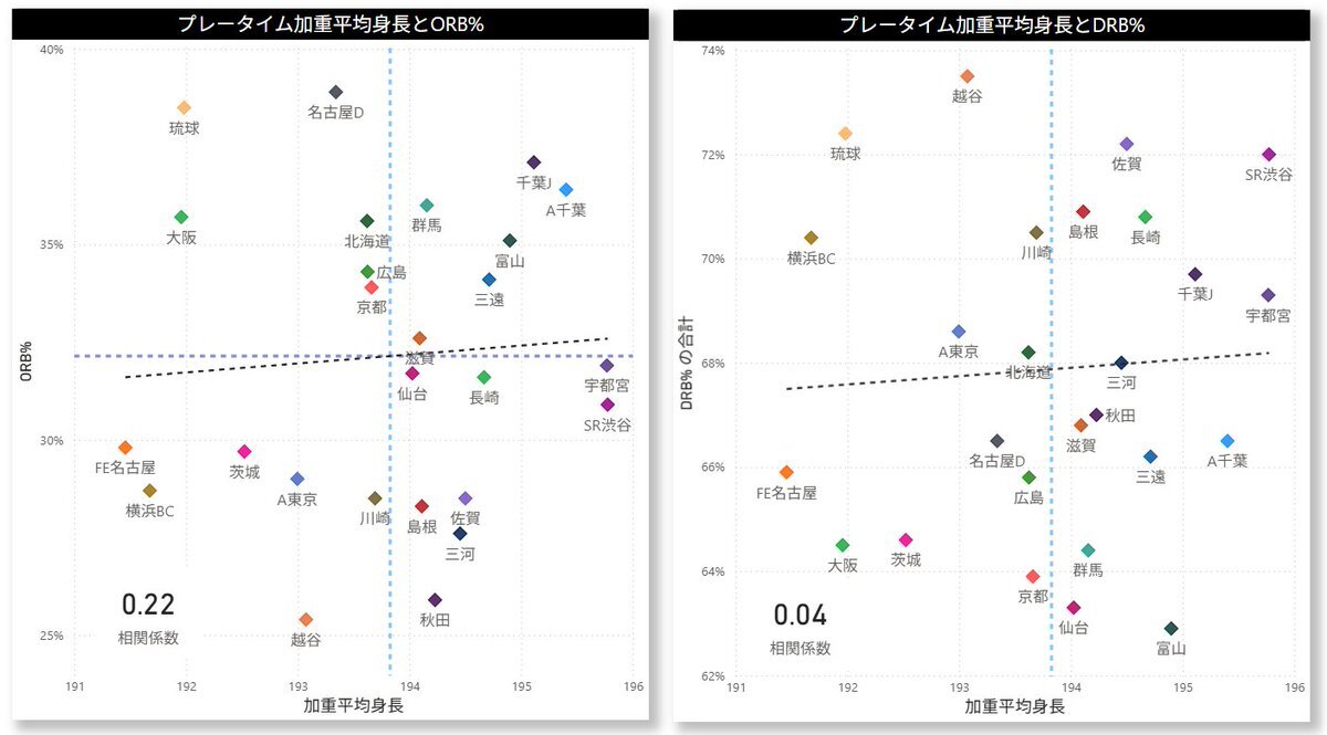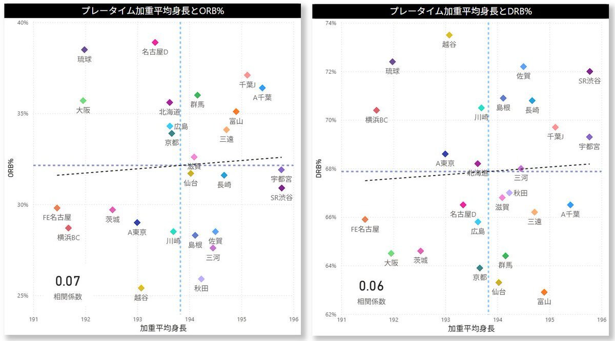 すいません、B1のビジュアルなのにB2も含んだ相関係数になってしまってました…。プレータイム加重平均での身長とオフェンス・ディフェンスリバウンド獲得率の訂正版です ほとんど相関はないので、身長高い選手を長く起用したからといって、リバウンドが取れるようになるわけではなさそうです。 x.com/ds_yanadori/st…