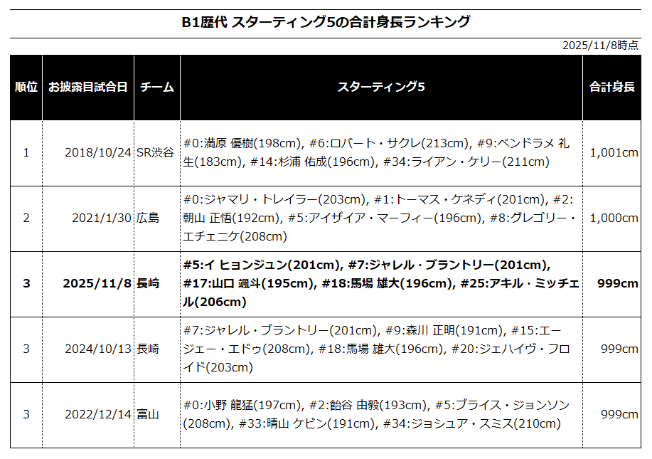 本日の長崎のスターター5人の合計身長は999cm! これは歴代3位タイの高身長スターターでした #データスタジアム pic.x.com/a2s0KHpyNG x.com/n_velca/status…