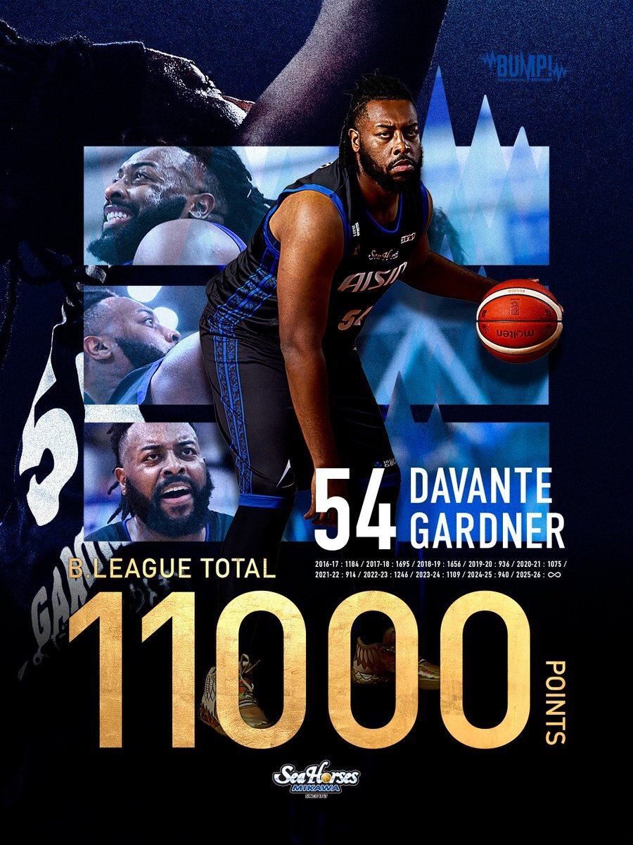 🎉記録達成🎉 11/9(日)仙台戦で、#54 ダバンテ・ガードナー選手が「B1個人通算11000得点」を達成しました🌟 B1史上初の快挙です。 おめでとうございます‼️ @DavanteGardner_ #ダバンテ・ガードナー #シーホース三河 #BUMP