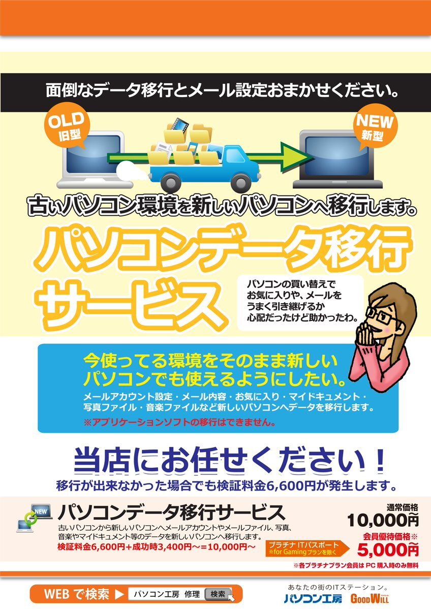 【サポートサービス紹介】 古いパソコン環境を新しいパソコンへ移行! 👨‍🔧パソコンデータ移行サービス👩‍🔧 メールアカウント設定・メール内容・お気に入り・マイドキュメント・写真ファイル・音楽ファイルなど新しいパソコンへデータを移行します。 #パソコン工房 #香椎 #サポート #データ移行 pic.x.com/L69DTUz6h1