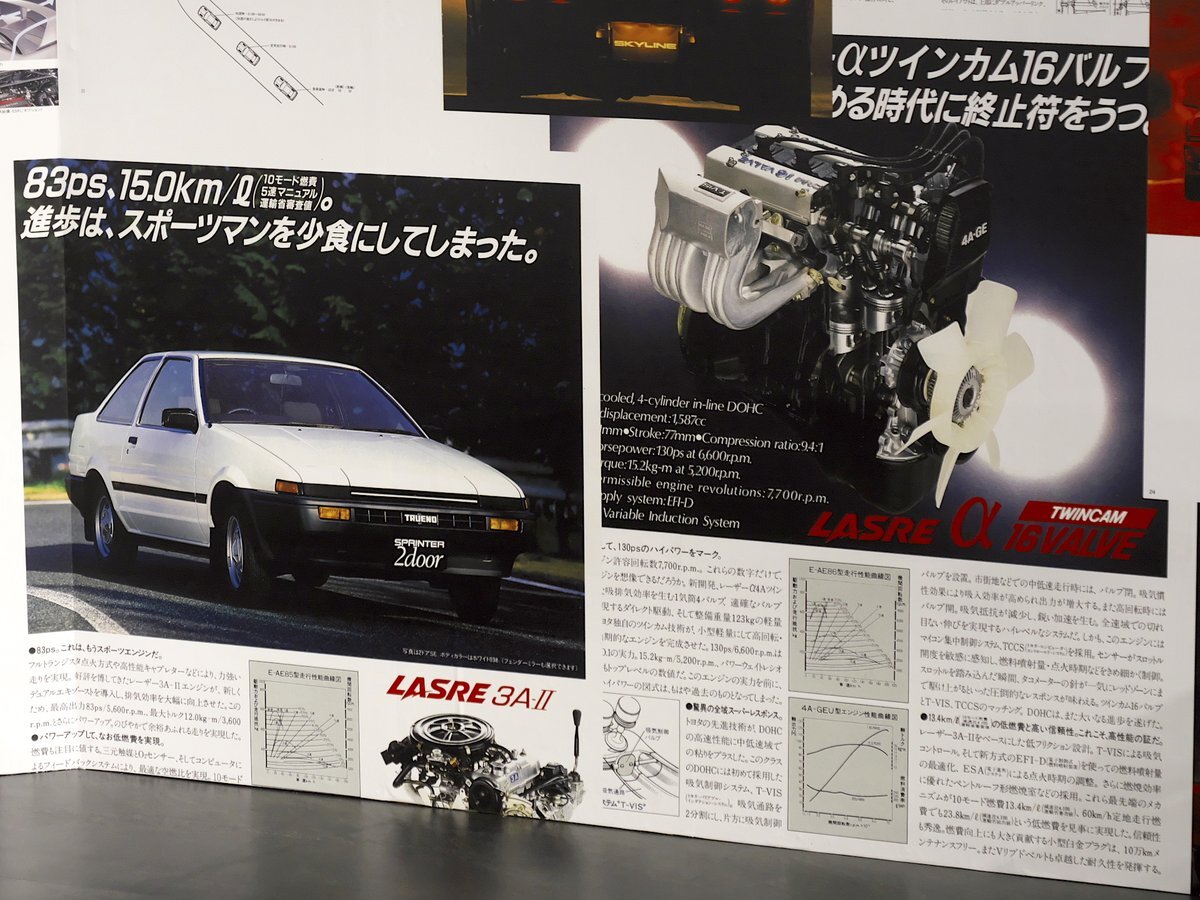 イツキが乗っていた車(AE85カローラレビン)は、カタログを素材にした背景の中にエンジン(3A-U)の上半分だけ登場 (・ω・).。oO(そりゃ、AE86 が積んでた 4A-GEU の方を目立つようにするわなあ...。 #トヨタ博物館 pic.x.com/CmE2YagFEy