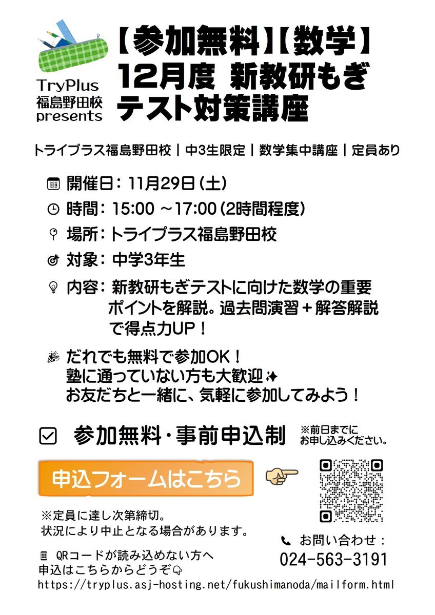 📣【新教研もぎテスト数学対策講座・参加無料】 🗓11/29(土)15:00〜17:00 会場:#トライプラス福島野田校 対象:中学3年生 過去問演習+解説で得点力UP✨ 塾外生も歓迎! 申込は前日まで👇 tryplus.asj-hosting.net/fukushimanoda/… #福島市 #中3 #新教研 #数学講座 #無料講座 pic.x.com/CRM6JJrtic