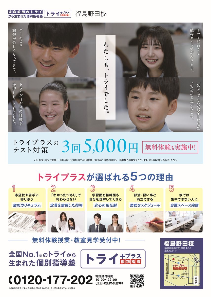 #トライプラス福島野田校 は「集団一律」じゃなく「一人ひとりに最適」な #個別指導! ・自分のペースで学べる ・相性ぴったりの講師 #無料体験 受付中! try-plus.com 📞0120-177-202 # #個別 #福島市 #学習塾 #岳陽 #野田 #清水 #四中 #森合 #庭坂 pic.x.com/ymDOw1xhHu