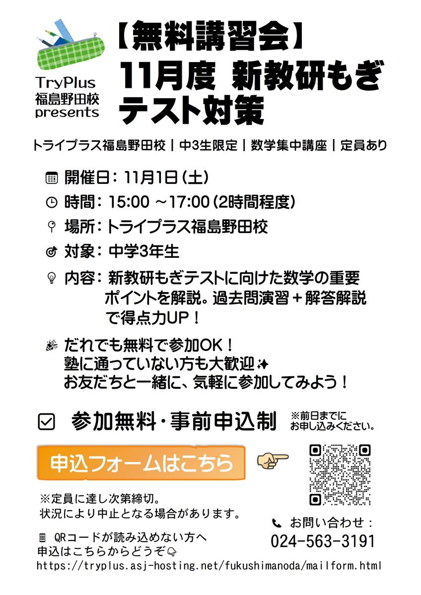 【来週の予定】11月1日(土)15時~17時、#数学対策講座 を実施予定です(無料)。 #新教研もぎテスト に向けて、教室でも準備が進んでいます。 申込はこちらから tryplus.asj-hosting.net/fukushimanoda/… #トライプラス福島野田校 #福島市 # #野田中 #清水中 #岳陽中 #四中 #吾妻中 pic.x.com/flpxXXb0ny