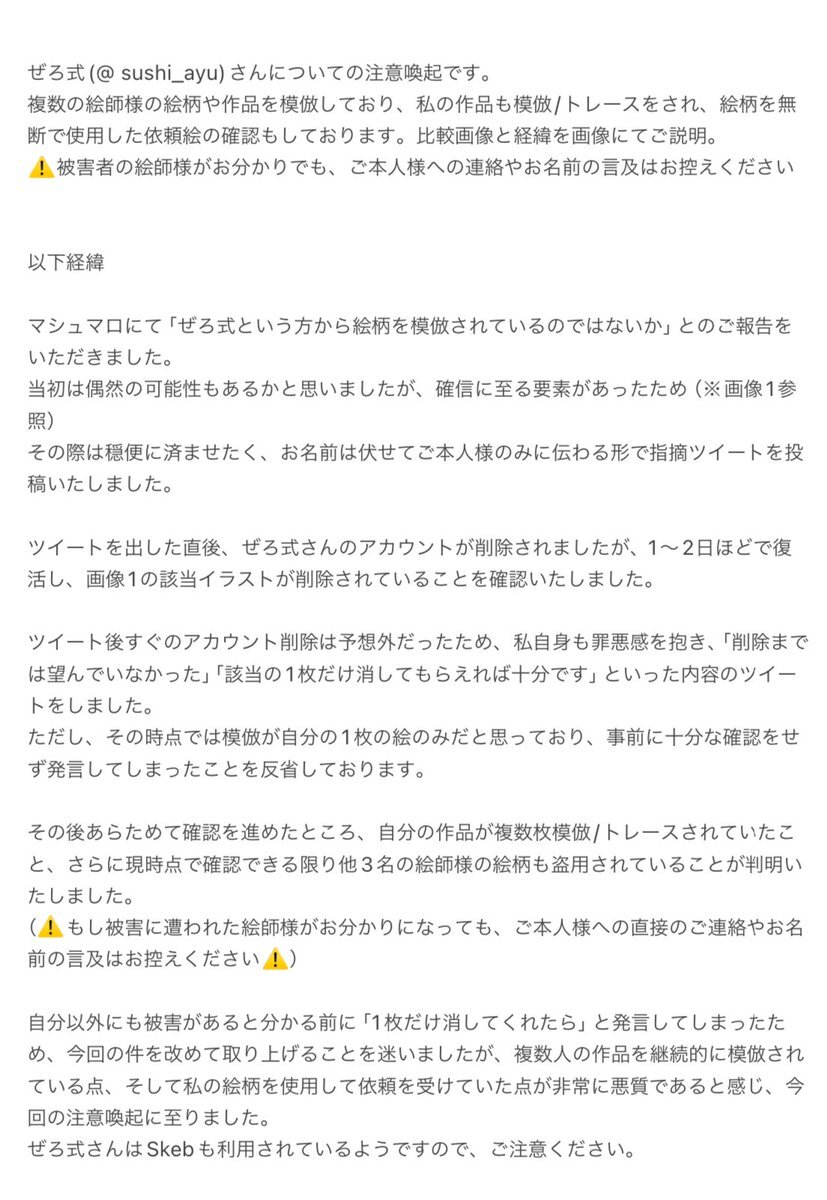 ぜろ式(@ sushi_ayu)についてです 複数の絵師様の絵柄に類似した点が見られ、私の作品も絵柄が近い点がありトレースも確認しております 経緯と比較は下記の画像/リプにまとめております。 ⚠️関係する絵師様を特定できても、ご本人様へのご連絡やお名前の言及はお控えください #注意喚起 #トレパク pic.x.com/UtSIjGGY7r
