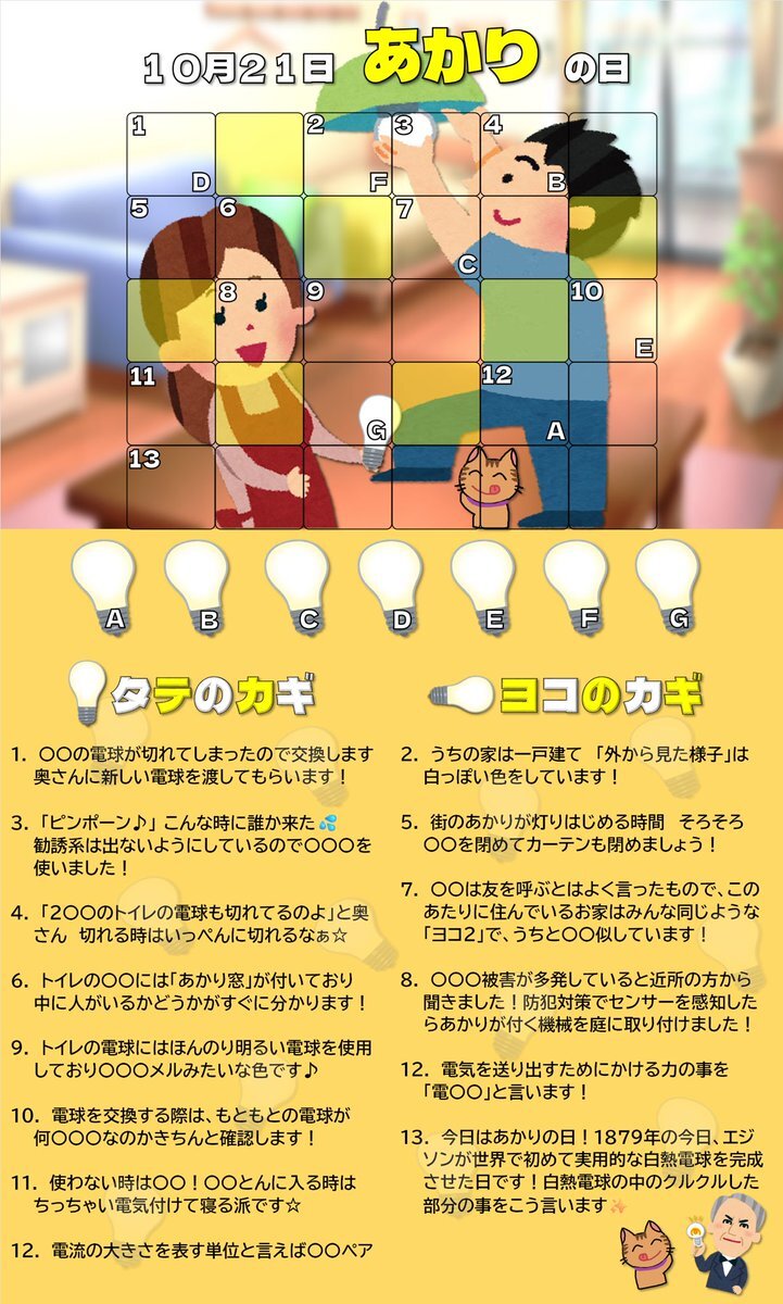 おはようございます! 今日は #あかりの日 って言う事で、電球を取り替えるクロスワードです💡✨ 1879年の今日、アメリカの発明家 #トーマス・エジソン が世界で初めて実用的な #白熱電球 を完成させました💡✨ 光り輝くピカピカな1日になりますように🔆✨ #クロスワード #パズル #今日は何の日 pic.x.com/ItYlQL0HJ4