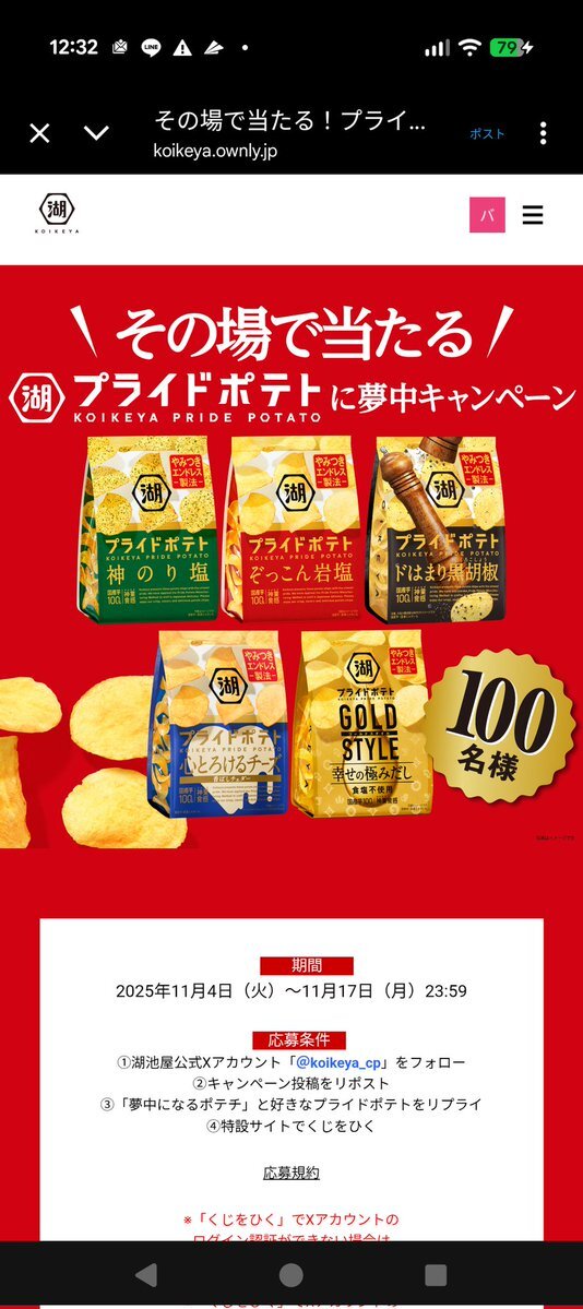\\その場で当たる‼️// プライドポテトに“もっと夢中”キャンペーン 1️⃣@koikeya_cp をフォロー&リポスト 2️⃣「夢中になるポテチ」と、好きなプライドポテトをリプライ 3️⃣動画をタップでくじに参加(11/12 10:59〆) 湖池屋プライドポテト詰め合わせを100名様に🎁✨ 規約はプロフィール欄へ📝