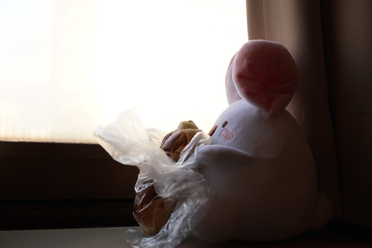 ホテルの窓から朝の都市を眺めながら、どんぐりのちくわパンを食べる── ユウガナアサダーナー… #ドコドコうさぎと一緒 pic.x.com/JLfGprVztl