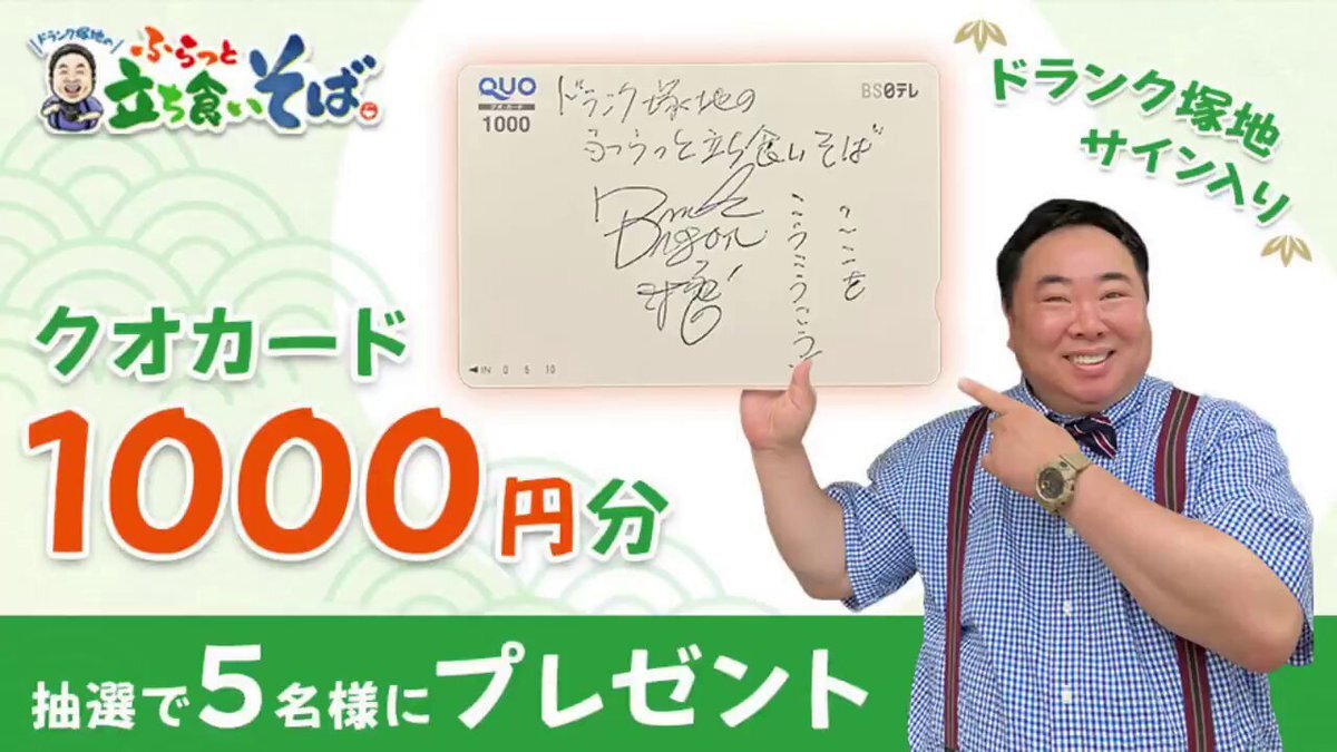 \㊗9/29から放送枠が1時間に拡大/ を記念して #プレゼントキャンペーン 🔥 #塚地武雅 サイン入りクオカード1000円分を 5名様にプレゼント🎁 💡応募方法 ① このアカウント(@bs4_tachisoba)をフォロー ② この投稿をリポスト 💡締切 29日(月)24時まで! #ふらそば #立ち食いそば #そば1h