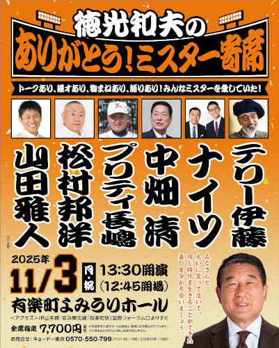 #徳光和夫 さん・ #ナイツ塙宣之 さん 【⚾️出演情報🟧】 『徳光和夫のありがとう!ミスター寄席』 ⚾️11/3(月・祝) 13:30〜 🧢有楽町よみうりホール 徳光さんが司会、ナイツのお二人も出演! "ミスター愛”にあるれるイベントになりそうです。 ✅yomi-h.jp/event/2025/11/… #speakeasy #TOKYOFM pic.x.com/qDQQLBAbl8