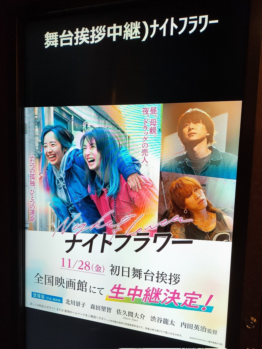 #ナイトフラワー見たよ 映画見終わって、明るくなって、余韻に浸って、 さあ、帰ろうかなって思ったら liveビューイングのお知らせが出てきた このために来たのに 映画見たら ライブビューイングを忘れてた💦 そして 「えー⁉️また見なきゃ‼️」 ってなりました #ナイトフラワー見た #佐久間大介 x.com/SAK_SAK_SAKUMA…