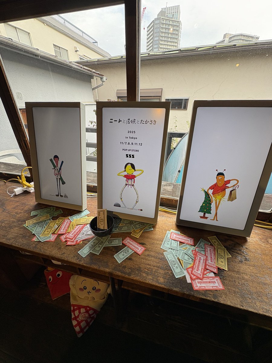ニ居たPOPUP最終日❣️ 仕事終わりに駆け込みで行ってきた!! しもちゃんとレジのお姉さん覚えててくれて本当に嬉しかった記憶力よ🥹🫶 片付けを手伝いに来たらしい木島にも会えてよかった!5日間お疲れ様でした!! #ニートと居候とたかさき展 #ニートと居候とたかさき #ニ居たPOPUP pic.x.com/PlWLWfdTG3