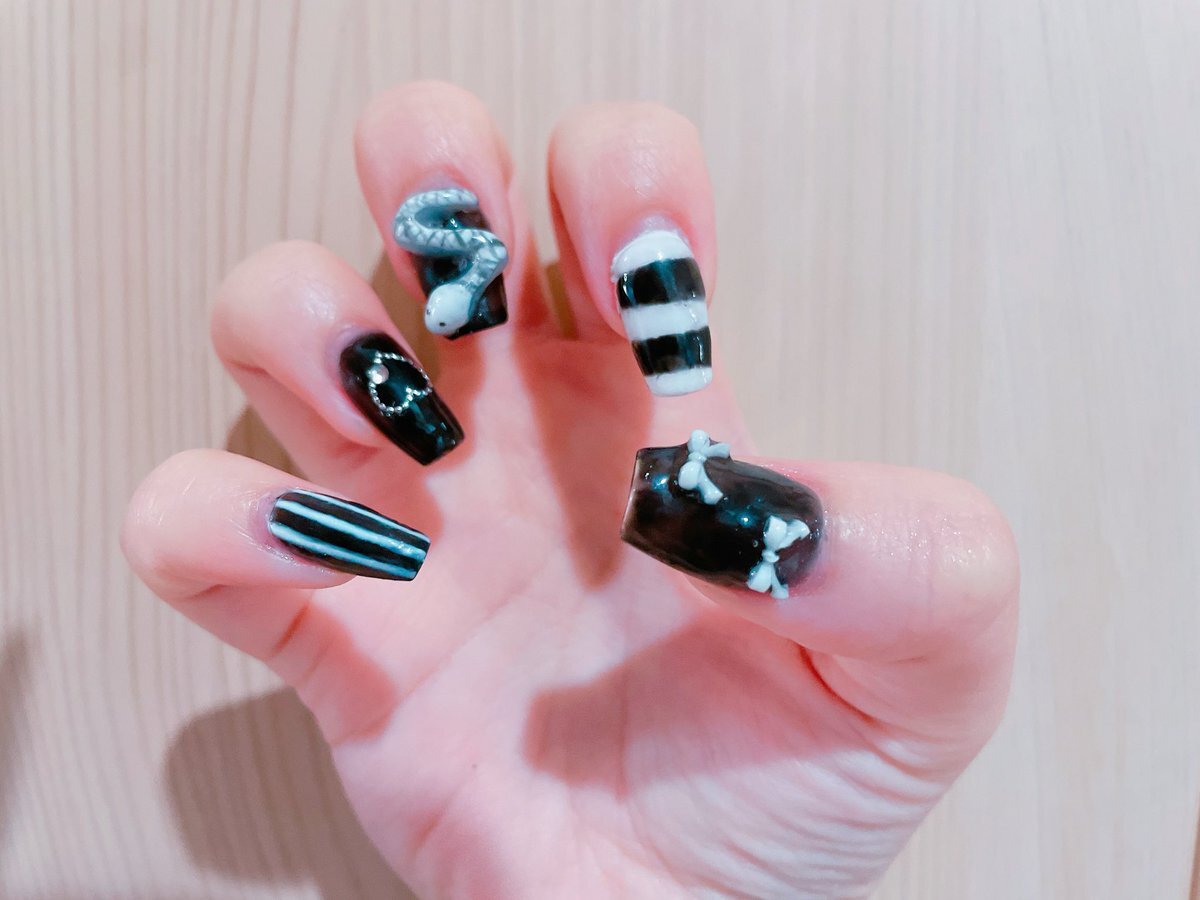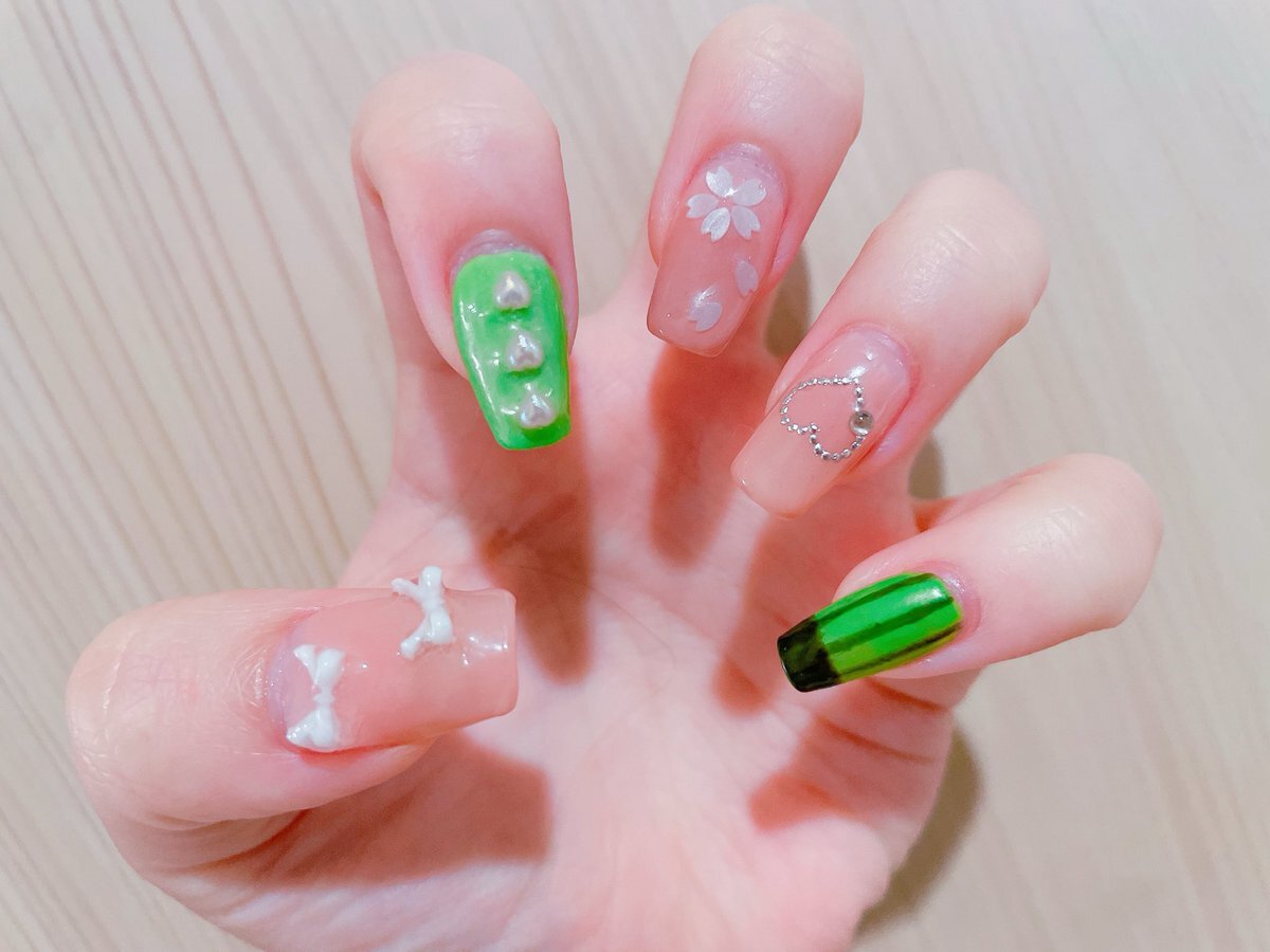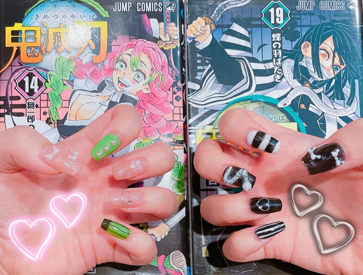 おばみつネイル💅 左が蜜璃ちゃん🌸、右が伊黒さん🐍 痛セルフネイル2回目の挑戦! 長さ出しチップのおかげで めっちゃいい感じになった🥹🫶満足! #セルフネイル #鬼滅ネイル #おばみつ #鬼滅の刃ネイル #ネイル好きさんと繋がりたい pic.x.com/4e0BUFUY9J