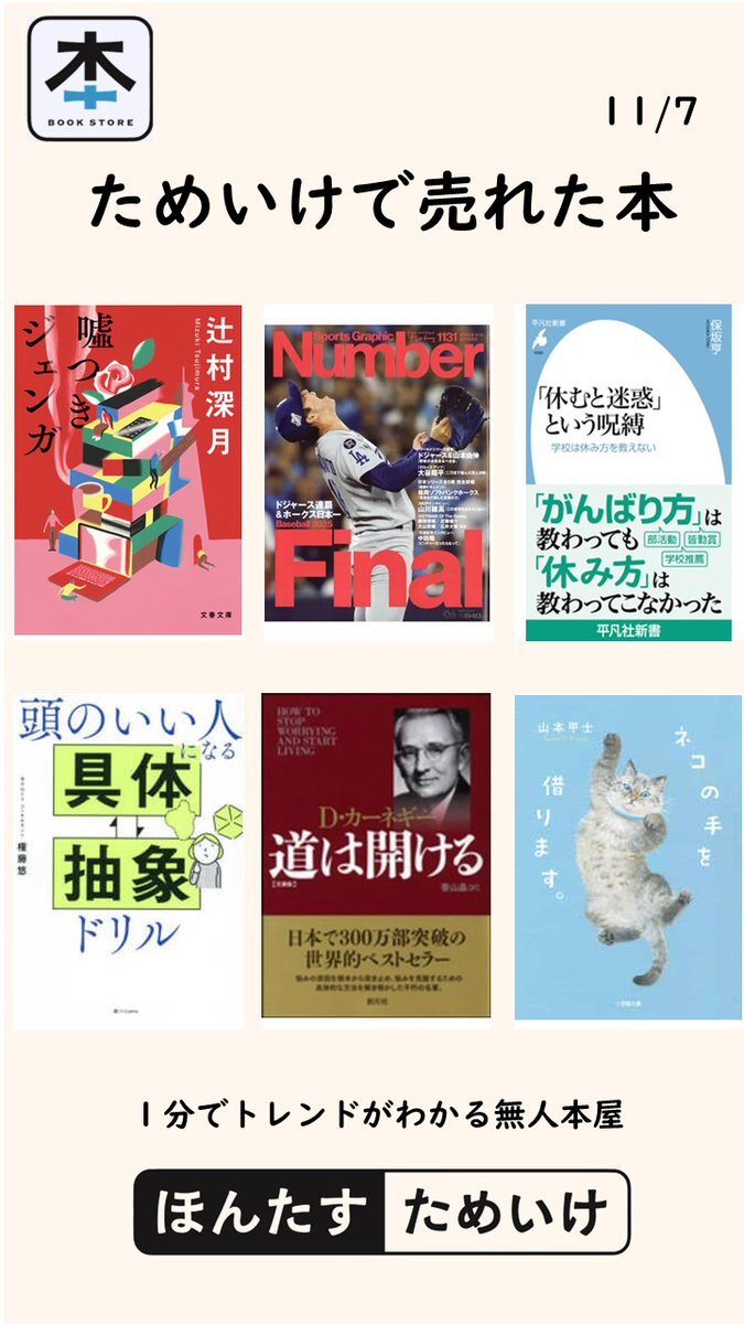 無人本屋 #ほんたす 11月7日は「立冬」 ココアの日です。 とんかつの日。 そして鍋の日。 暖かいものが欲しくなる日。 では昨日売れた本の紹介📚 #嘘つきジェンガ #Number 2025年11/20号 #「休むと迷惑」という呪縛 #頭のいい人になる 具体・抽象ドリル #道は開ける 文庫版 #ネコの手を借りますpic.x.com/QE0fdLA0iN