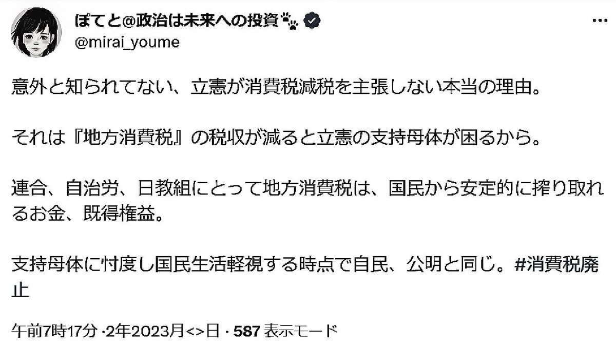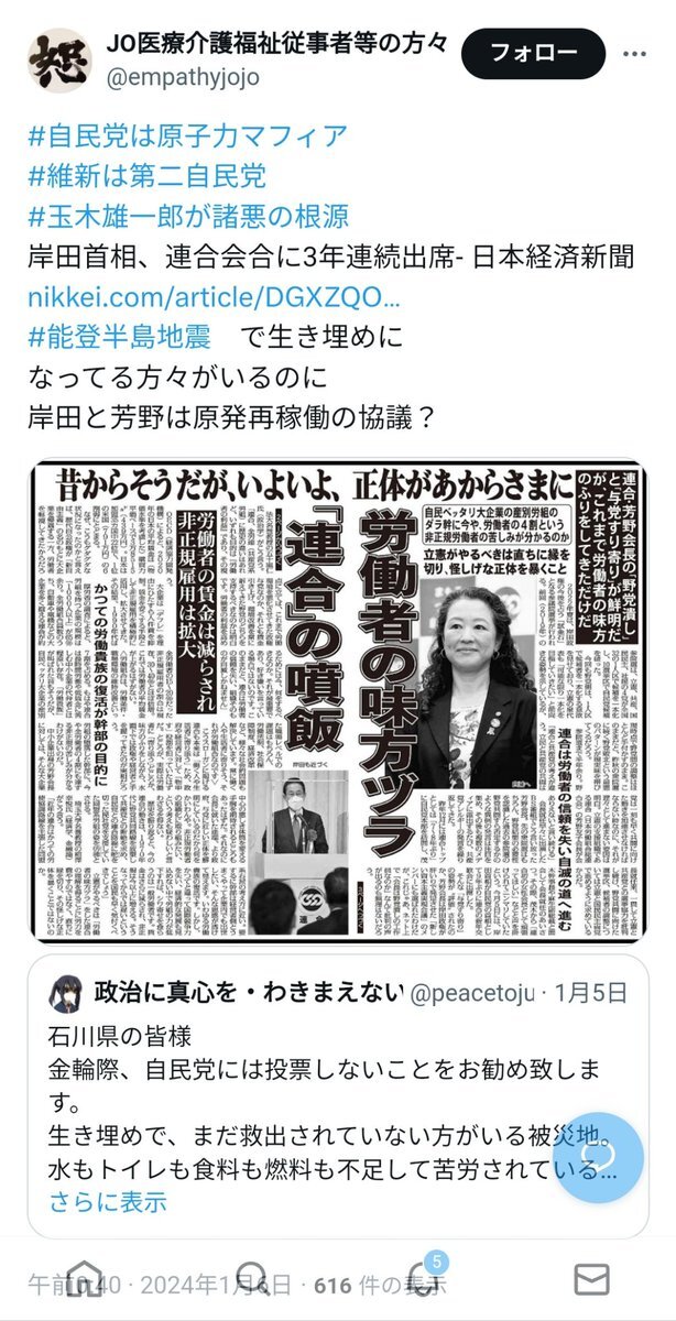 返信先:@BaronKinoko#悪政5党(統一教会)世論工作員= #ネトウヨの支離滅裂な思考発言 TW。先進国では標準の政策を掲げるれいわ新選組を中傷しつつ,真逆の悪政を続ける犯罪組織・自民党の方が何百倍もマシという反社会的思考に基づく情弱向け工作の資金源は経団連か連合(#芳野友子)かもしれない x.com/BaronKinoko/st… pic.x.com/q5BY1go1D3