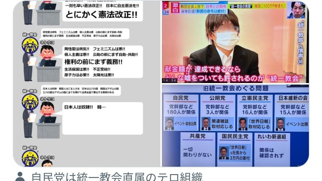 返信先:@today31061妄想を基に山本太郎議員を中傷する↓#ネトウヨの支離滅裂な思考発言 TW。#悪政4党(統一教会)の敵政党が全て宗教団体に見えるらしい。安倍スガ岸田犯罪を正当化する事が目的化し,脳内で事実を改変した #ネトウヨ現実逃避 を他人に投げ付ける末期症状..x.com/umekichkun/sta… x.com/today3106/stat… pic.x.com/hZqFRhumrm