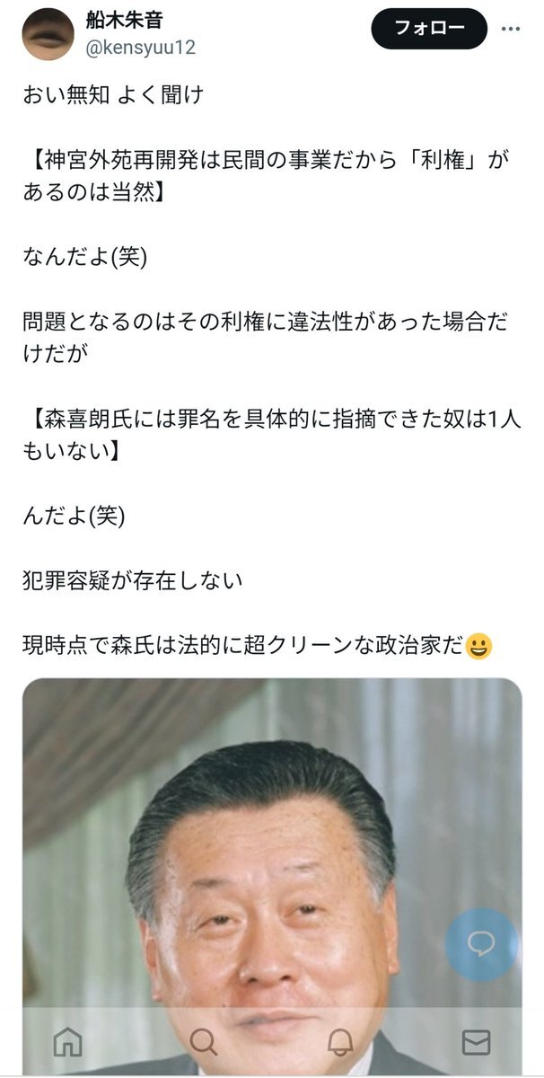 返信先:@kensyuu12問題はお前の興味ではなく"整合性"。お前「森喜朗は現時点で法的に超クリーンな政治家」と断言して絡んできたよな?「犯罪容疑が存在しない」とも。なら五輪汚職で逮捕されたらマズいんじゃないの笑 #ネトウヨの支離滅裂な思考発言 #ネトウヨは統一教会信者 #自民党は統一教会 x.com/kensyuu12/stat… pic.x.com/8giV2zGDN4