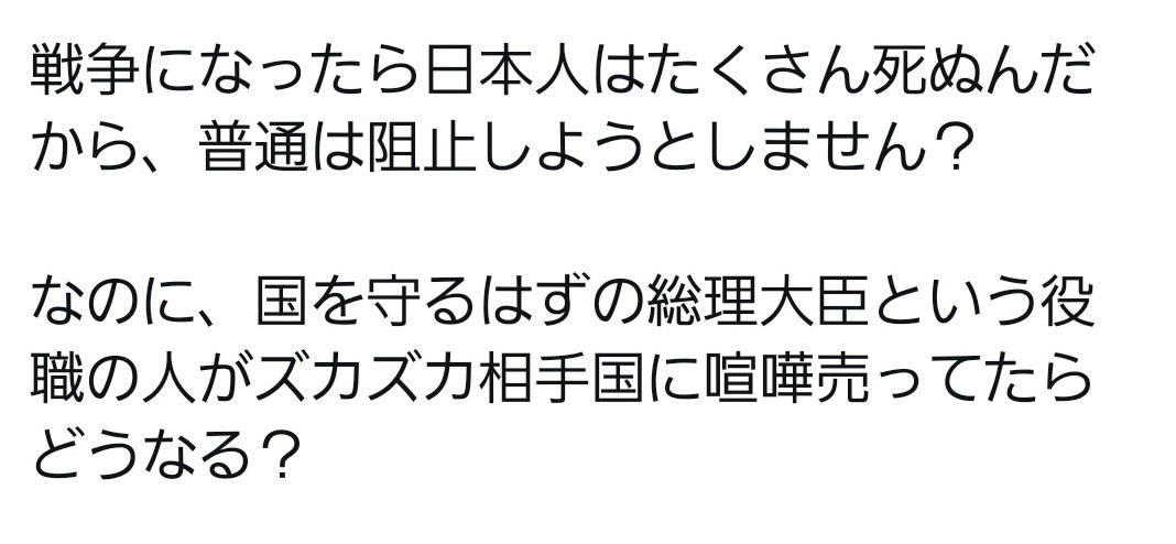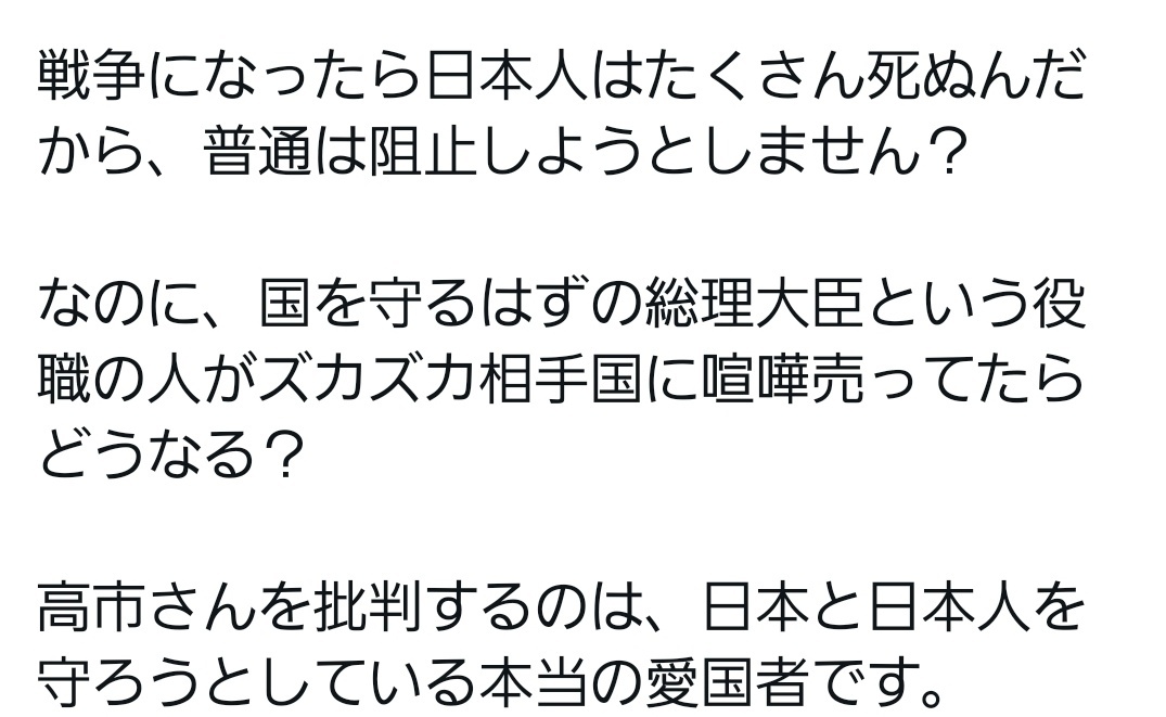返信先:@Lucius334他国だと認識していれば 他の国の内紛のために日本がわざわざ憲法を変え、命や国土を賭けてまで戦争誘致するのはおかしいと気付くはず😃 普通は国民の命や生活を守るために、戦争、紛争からは身を引くはずですが 高市さんは真逆を行ってますね #ネトウヨは日本の事なんてこれっぽっちも考えていません
