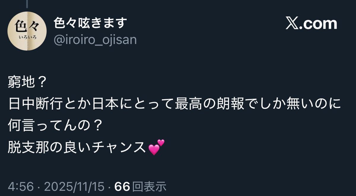 高市自身のせいなんだけど。どこの世界にいるのかな? #噓つきはアベウヨの始まり #アベウヨって恥ずかしい #ネトウヨあほ列伝 #日本の恥 #存立危機事態 #ネトウヨやらかし大賞2025 x.com/zezehihidayo/s…